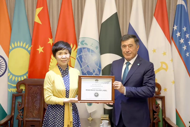 Ms Zhang Qin handed the Secretary-General a World Athletics certificate on awarding the silver label to the SCO Kunming Marathon. She told him about the preparations for the 5th marathon which is to be held in December 2020. The format and scale of the event will depend on the epidemiological situation in China. Consideration is being given to the possibility of holding the marathon in several Chinese cities with a small number of participants (Chinese nationals and foreign nationals permanently residing in China). At the moment, consultations are being held with China's relevant sports agencies.